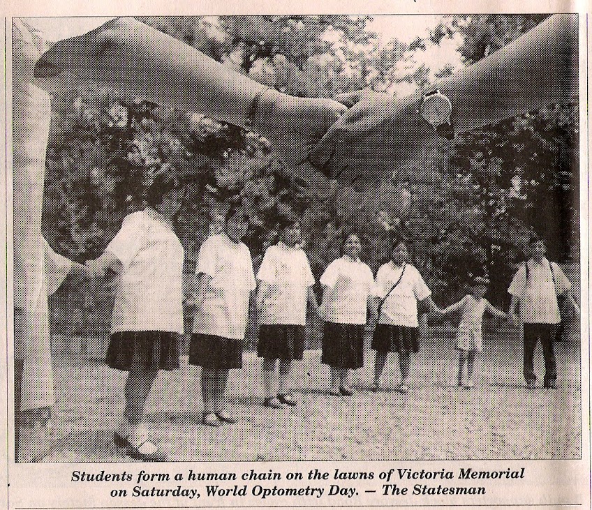 The photo below is from one such outing; Pupli and I are on the right. It was a school trip to see the Victoria Memorial, but when we were having lunch on the lawns, some people offered us (oversized) World Optometry Day t-shirts and asked if we could pose for a photo, which appeared in a newspaper the next day.